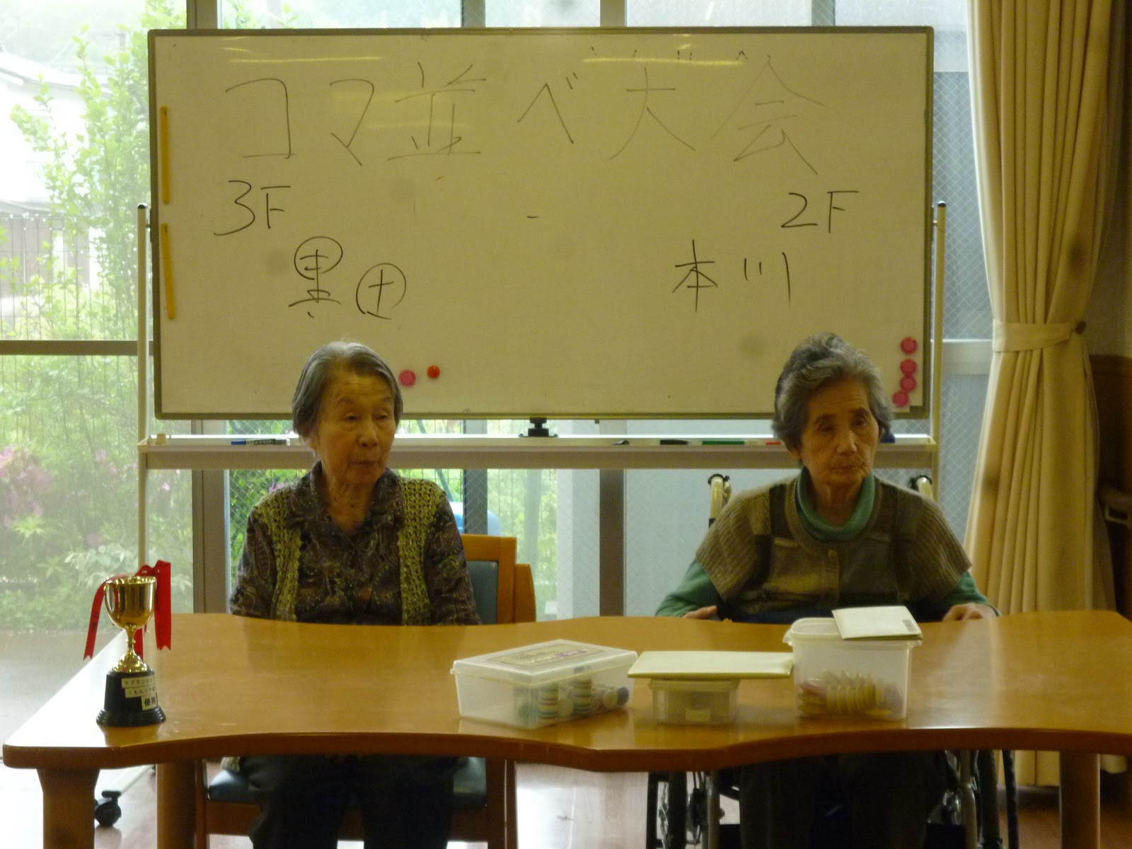 くもん委員会主催のコマならべ大会です。数字盤の上に数字の書いたコマを並べるゲームですが、コマをつまむ手とコマの位置を探す目の動きのリハビリになるということで、日常のレクレーションに取り入れています。2,3階の対決に皆さん燃えています。今回は2Fの勝ちでした!